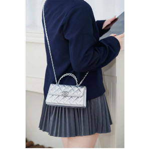 샤넬 26C 25 스몰 핸드백 실버 메탈릭 그레인드 카프스킨